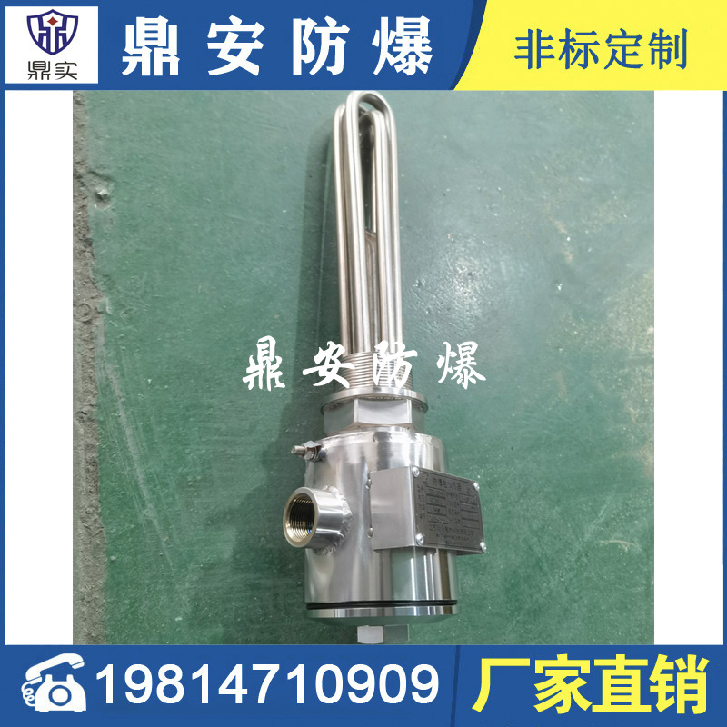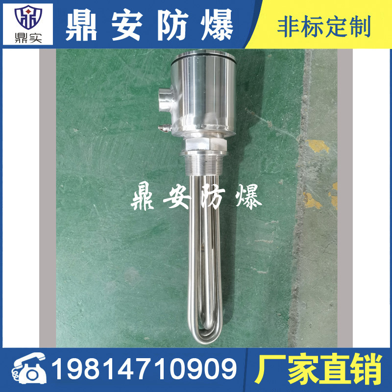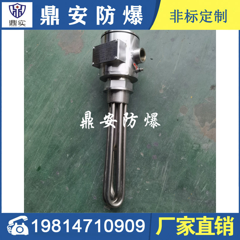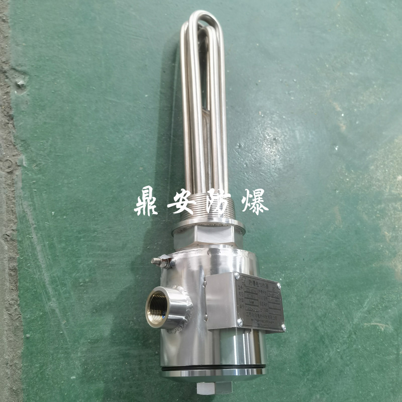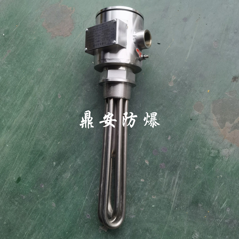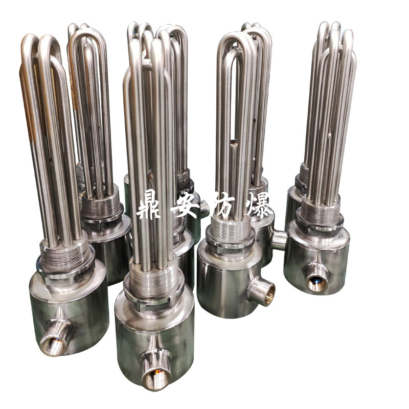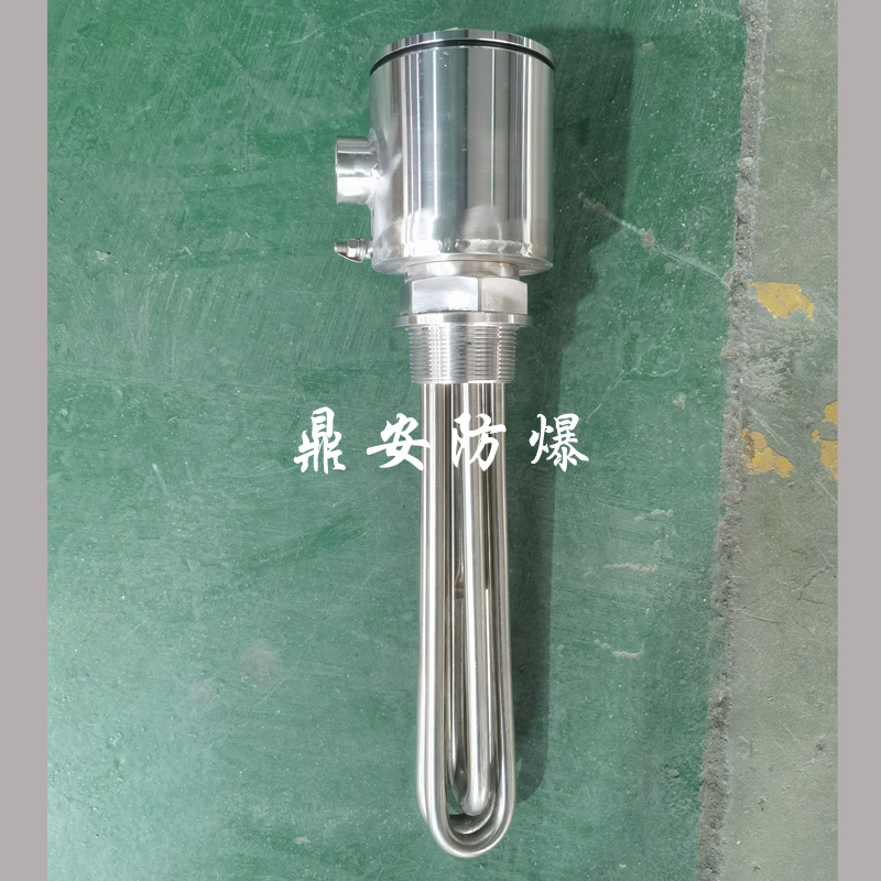 防爆法蘭電加熱管(也稱插入式電加熱器):是采用U型管狀電熱元件,依據加熱不同介質設計規(guī)范,按照功率配置要求裝配在法蘭蓋上,插入需加熱物料中,發(fā)熱元件工作時所發(fā)出的大量熱量傳導給被加熱介質使介質溫度升高,達到所需的工藝要求。當介質溫度達到工藝要求的設定值時,控制系統(tǒng)根據溫度傳感器信號,經PID 運算后調節(jié)電加熱器輸出功率,對發(fā)熱元件的電阻性負載實現溫度控制。使介質溫度均勻,達到所需要求;當發(fā)熱元件超溫或低液位時,發(fā)熱元件的聯(lián)鎖保護裝置立即切斷加熱電源避免發(fā)熱元件燒壞,延長使用壽命。