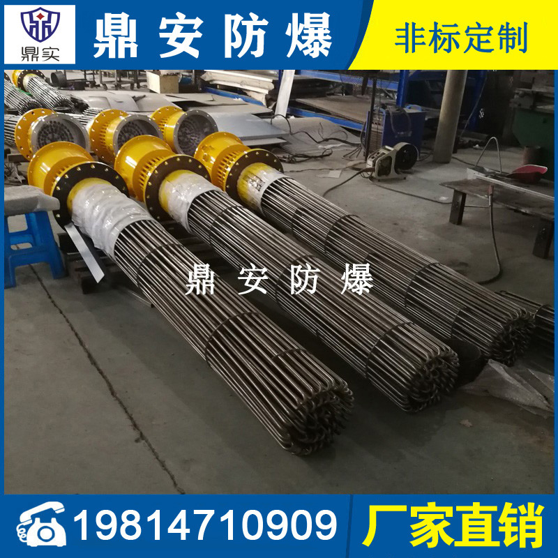 防爆法蘭加熱管是由多支加熱管焊接在法蘭上集中加熱。主要用于敞開式、封閉式的溶液箱和循環(huán)系統(tǒng)中加熱用。優(yōu)點: 表面功率大,使一般電加熱表面負荷的2~4倍,高度密集式、結(jié)構(gòu)緊湊。由于整體短而密集,故穩(wěn)定性好,安裝無需支架。組合式法蘭加熱管大多采用氬弧焊接方式使電熱管于法蘭連接,也可利用緊固裝置的形式,即每支電熱管上焊由緊固件。然后與法蘭蓋采用螺母鎖緊。管子于緊固件采用氬弧焊接。漏緊固件密封處采用科學的工藝。單支更換方便,大大節(jié)約以后的維修成本選擇進口及國內(nèi)優(yōu)質(zhì)材料??茖W的生產(chǎn)工藝,嚴格的質(zhì)量管理,保證電熱管優(yōu)越的電氣性能。