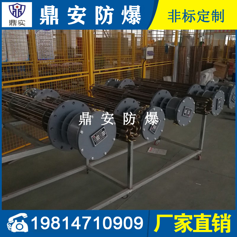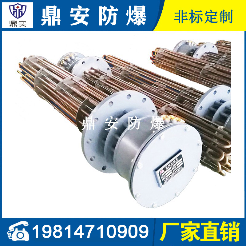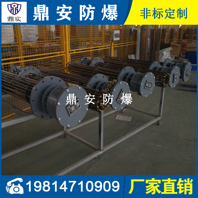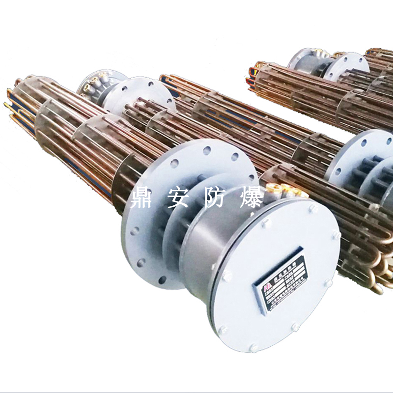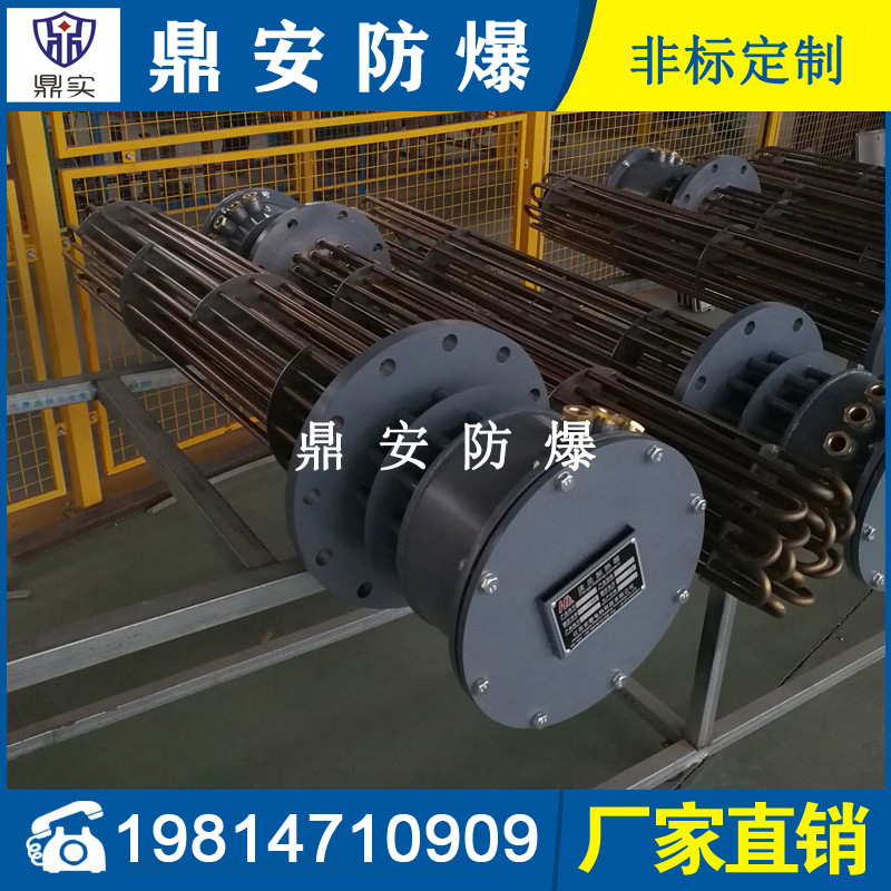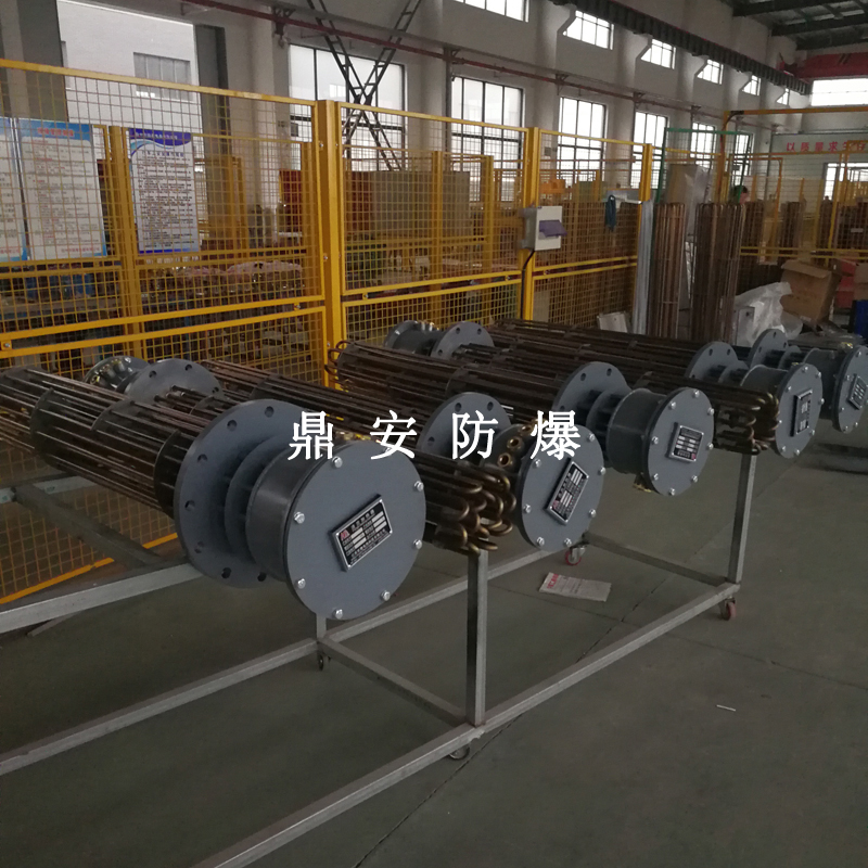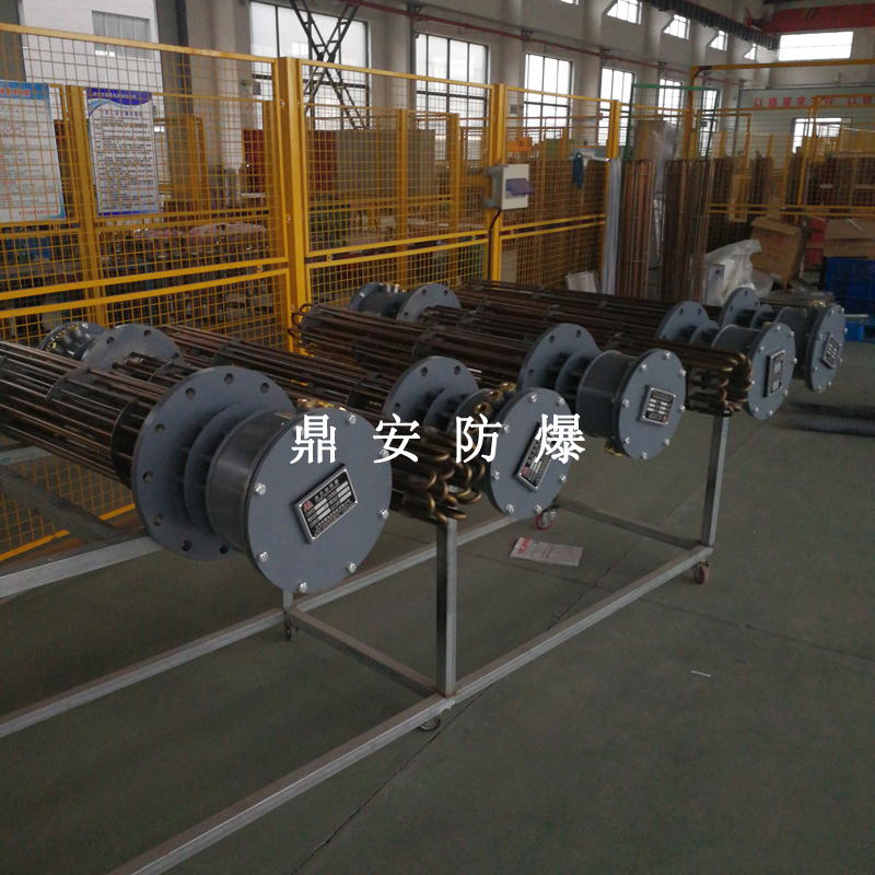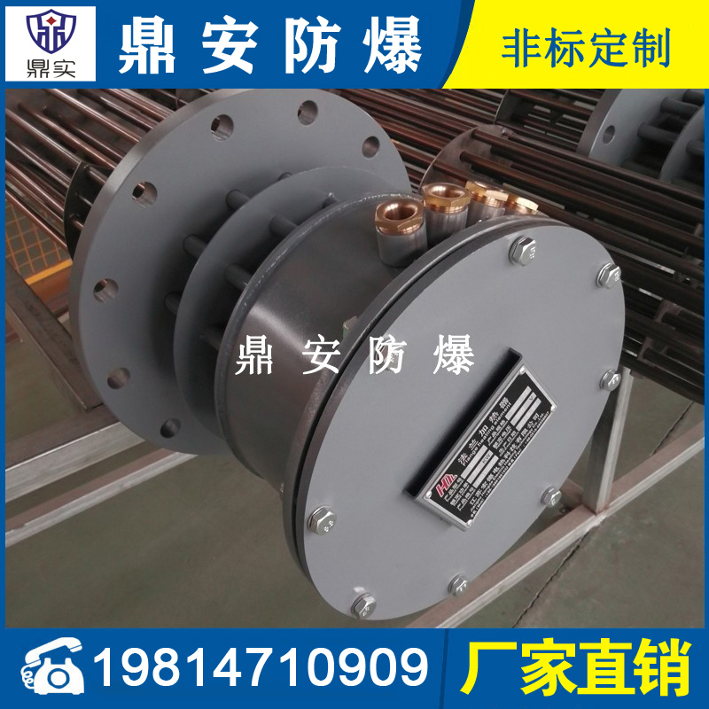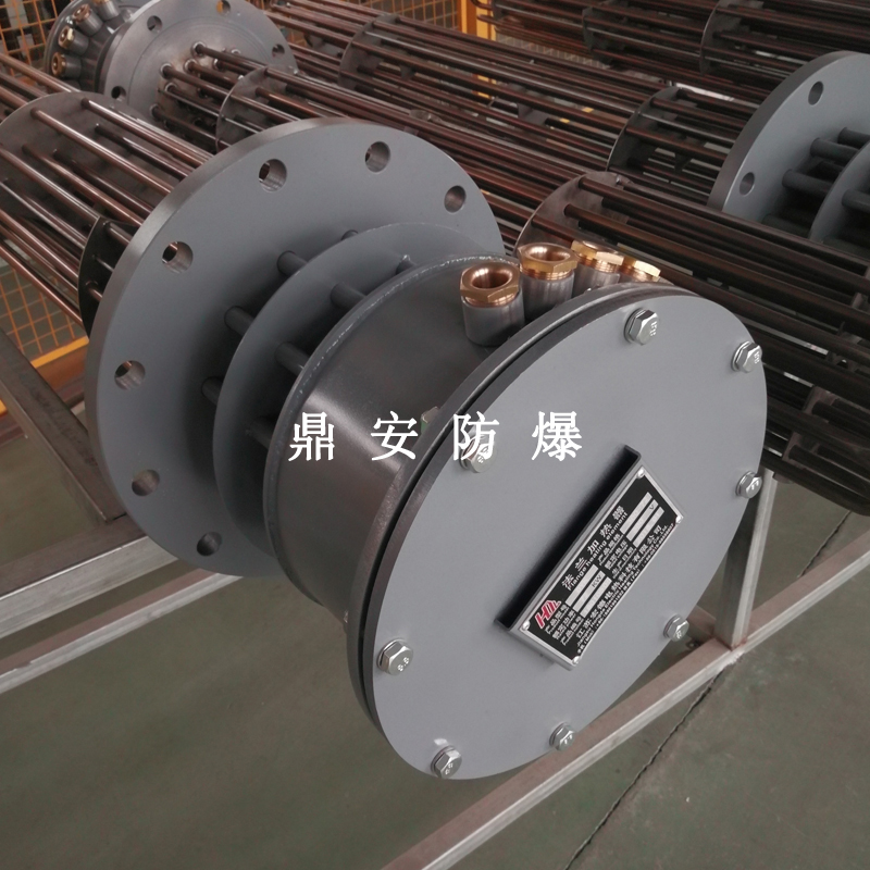 防爆法蘭加熱管是由多支加熱管焊接在法蘭上集中加熱。主要用于敞開式、封閉式的溶液箱和循環(huán)系統(tǒng)中加熱用。優(yōu)點: 表面功率大,使一般電加熱表面負荷的2~4倍,高度密集式、結(jié)構(gòu)緊湊。由于整體短而密集,故穩(wěn)定性好,安裝無需支架。組合式法蘭加熱管大多采用氬弧焊接方式使電熱管于法蘭連接,也可利用緊固裝置的形式,即每支電熱管上焊由緊固件。然后與法蘭蓋采用螺母鎖緊。管子于緊固件采用氬弧焊接。緊固件密封處采用科學的工藝。單支更換方便,大大節(jié)約以后的維修成本選擇進口及國內(nèi)優(yōu)質(zhì)材料??茖W的生產(chǎn)工藝,嚴格的質(zhì)量管理,保證電熱管優(yōu)越的電氣性能。