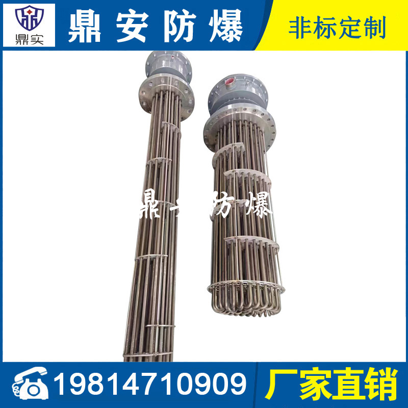 防爆法蘭電加熱管(也稱(chēng)插入式電加熱器):是采用U型管狀電熱元件,依據(jù)加熱不同介質(zhì)設(shè)計(jì)規(guī)范,按照功率配置要求裝配在法蘭蓋上,插入需加熱物料中,發(fā)熱元件工作時(shí)所發(fā)出的大量熱量傳導(dǎo)給被加熱介質(zhì)使介質(zhì)溫度升高,達(dá)到所需的工藝要求。當(dāng)介質(zhì)溫度達(dá)到工藝要求的設(shè)定值時(shí),控制系統(tǒng)根據(jù)溫度傳感器信號(hào),經(jīng)PID 運(yùn)算后調(diào)節(jié)電加熱器輸出功率,對(duì)發(fā)熱元件的電阻性負(fù)載實(shí)現(xiàn)溫度控制。使介質(zhì)溫度均勻,達(dá)到所需要求;當(dāng)發(fā)熱元件超溫或低液位時(shí),發(fā)熱元件的聯(lián)鎖保護(hù)裝置立即切斷加熱電源避免發(fā)熱元件燒壞,延長(zhǎng)使用壽命。