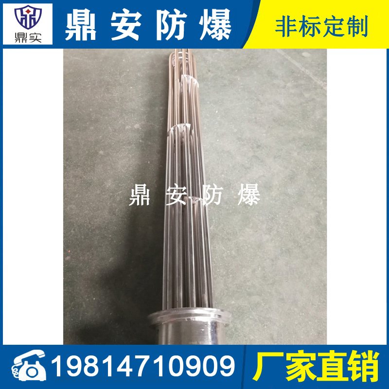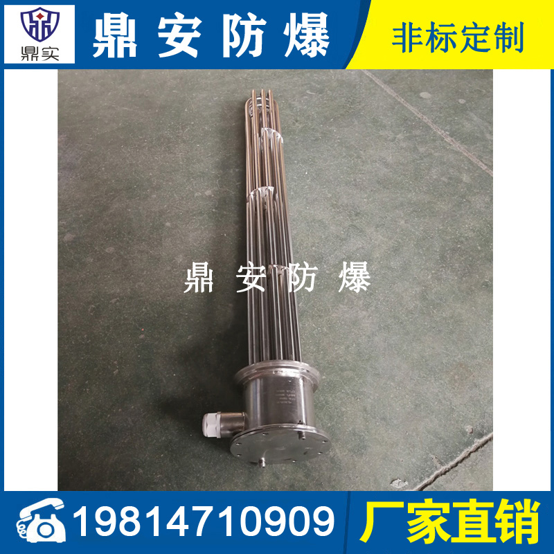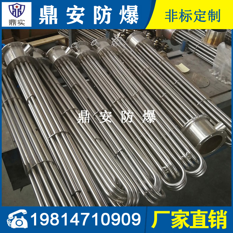 法蘭電熱管(也稱插入式電加熱器):是采用U型管狀電熱元件,多支U型電熱管焊接在法蘭上集中加熱,依據(jù)加熱不同介質(zhì)設(shè)計規(guī)范,按照功率配置要求裝配在法蘭蓋上,插入需加熱物料中,發(fā)熱元件工作時所發(fā)出的大量熱量傳導(dǎo)給被加熱介質(zhì)使介質(zhì)溫度升高,達到所需的工藝要求,主要用于敞開式、封閉式的溶液箱和循環(huán)系統(tǒng)中加熱用。