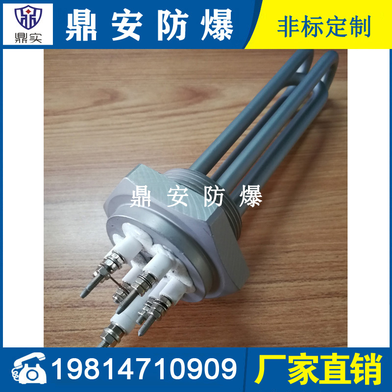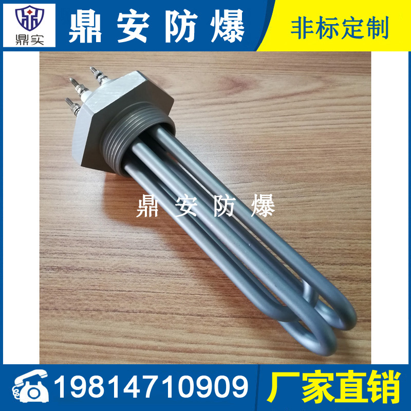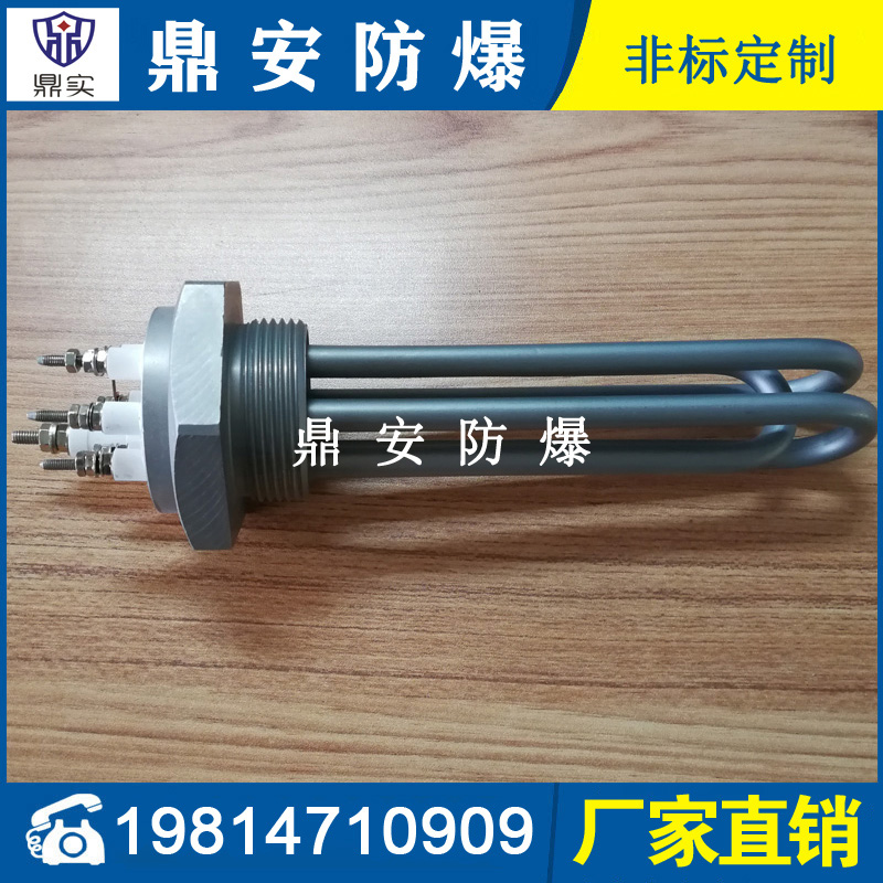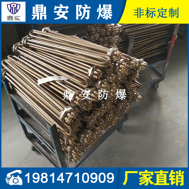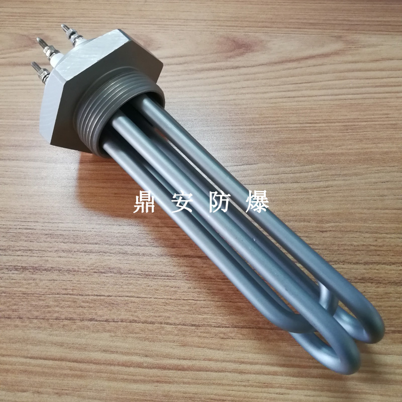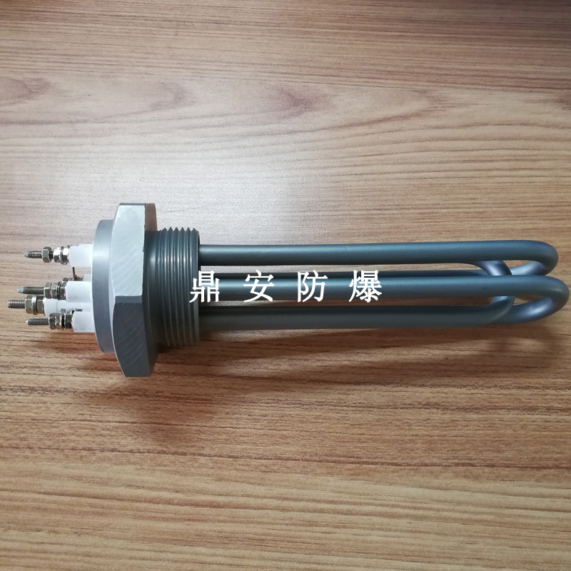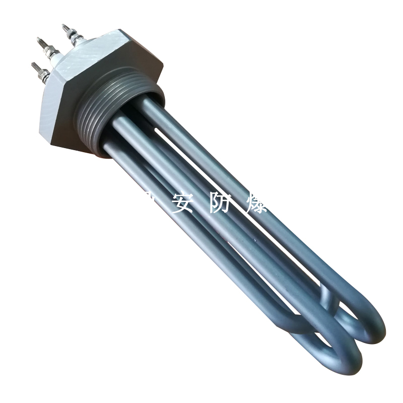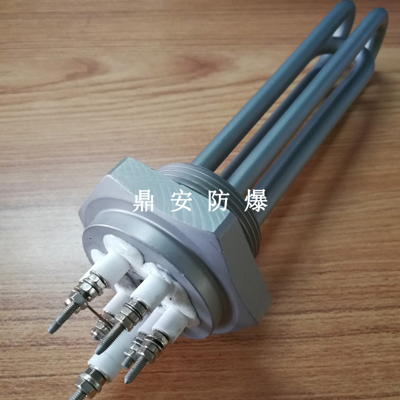 法蘭電熱管(也稱插入式電加熱器):是采用U型管狀電熱元件,多支U型電熱管焊接在法蘭上集中加熱,依據(jù)加熱不同介質(zhì)設(shè)計規(guī)范,按照功率配置要求裝配在法蘭蓋上,插入需加熱物料中,發(fā)熱元件工作時所發(fā)出的大量熱量傳導(dǎo)給被加熱介質(zhì)使介質(zhì)溫度升高,達到所需的工藝要求,主要用于敞開式、封閉式的溶液箱和循環(huán)系統(tǒng)中加熱用。