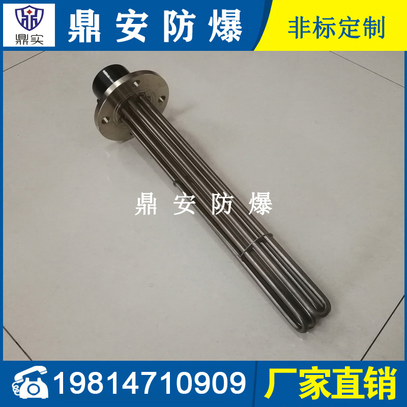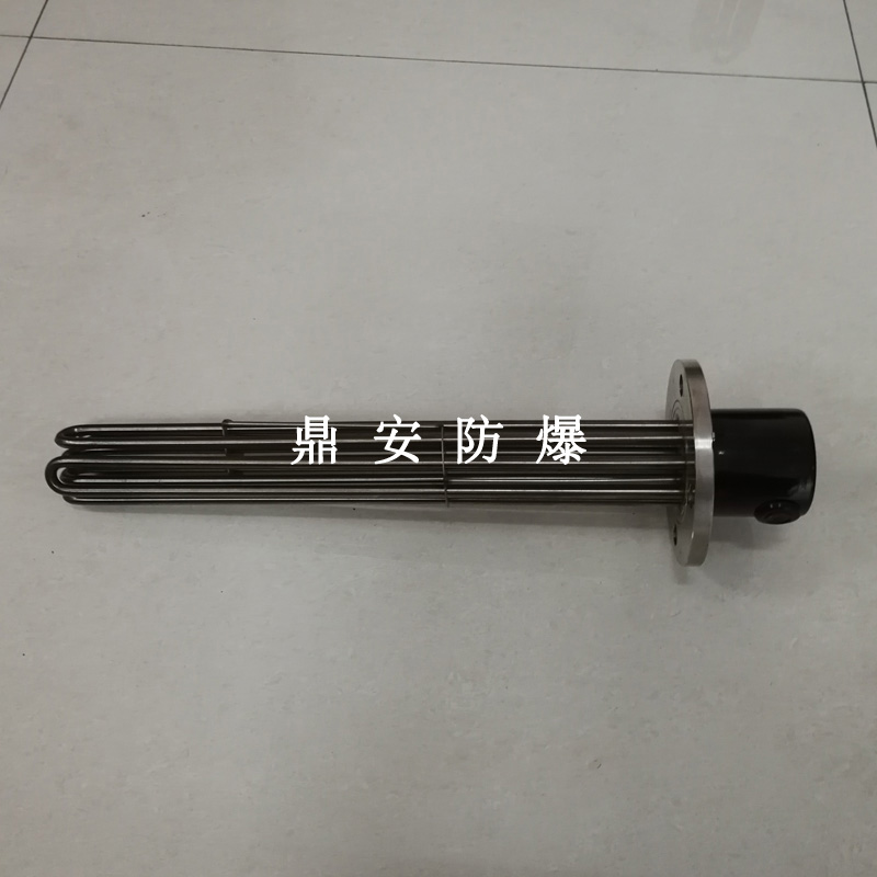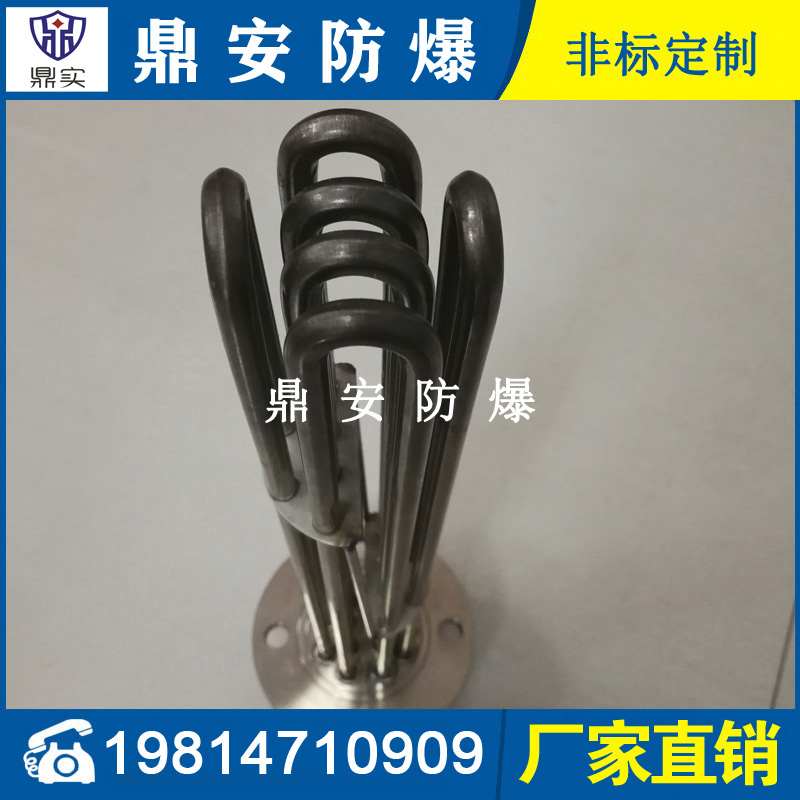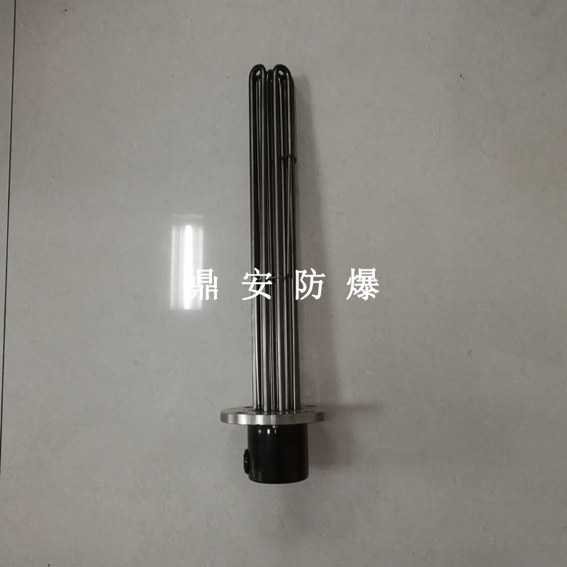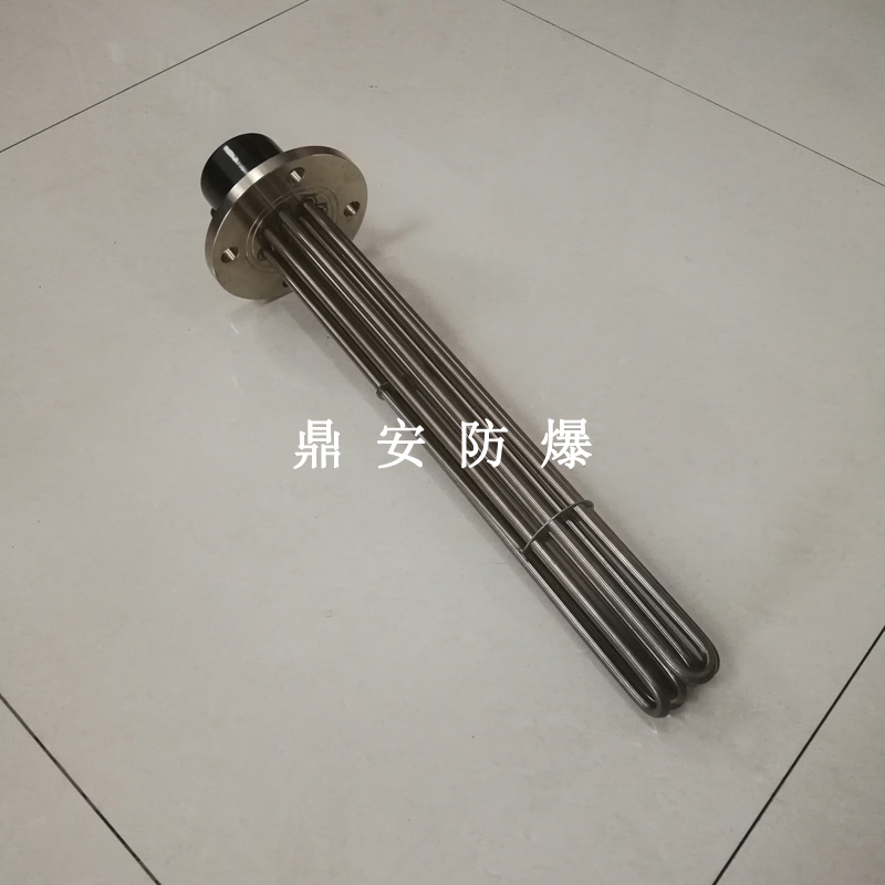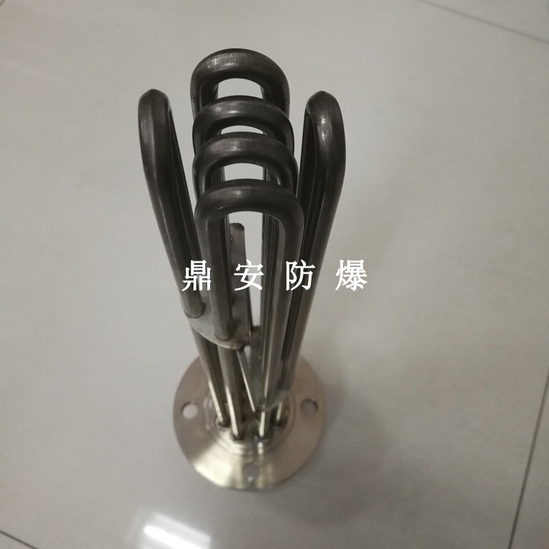 法蘭電熱管(也稱插入式電加熱器):是采用U型管狀電熱元件,多支U型電熱管焊接在法蘭上集中加熱,依據(jù)加熱不同介質(zhì)設(shè)計(jì)規(guī)范,按照功率配置要求裝配在法蘭蓋上,插入需加熱物料中,發(fā)熱元件工作時(shí)所發(fā)出的大量熱量傳導(dǎo)給被加熱介質(zhì)使介質(zhì)溫度升高,達(dá)到所需的工藝要求,主要用于敞開(kāi)式、封閉式的溶液箱和循環(huán)系統(tǒng)中加熱用。
