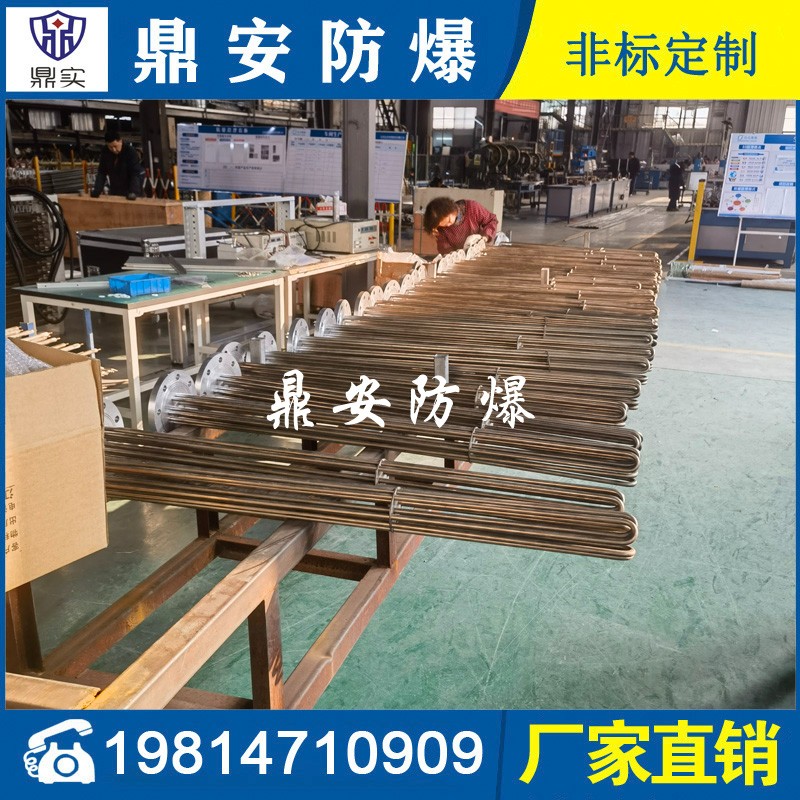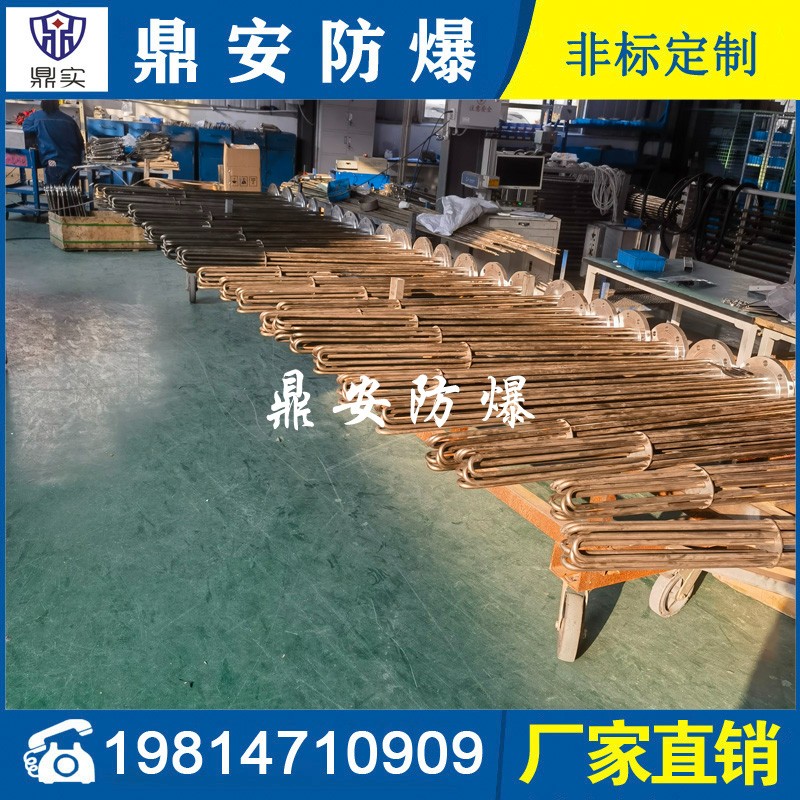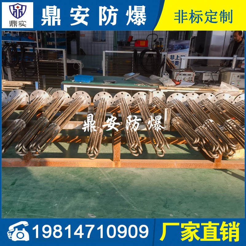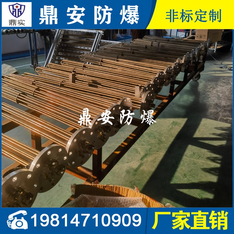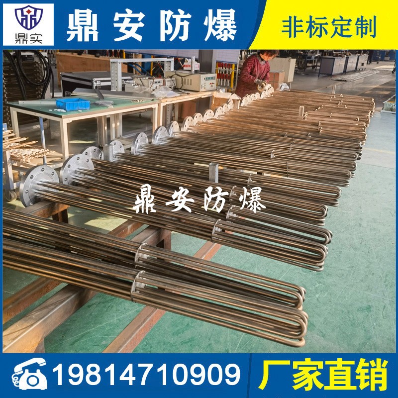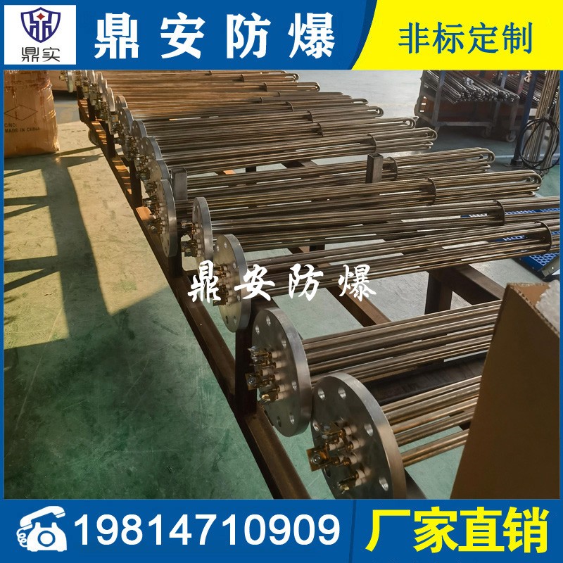 法蘭電熱管(也稱插入式電加熱器):是采用U型管狀電熱元件,多支U型電熱管焊接在法蘭上集中加熱,依據(jù)加熱不同介質(zhì)設(shè)計規(guī)范,按照功率配置要求裝配在法蘭蓋上,插入需加熱物料中,發(fā)熱元件工作時所發(fā)出的大量熱量傳導給被加熱介質(zhì)使介質(zhì)溫度升高,達到所需的工藝要求,主要用于敞開式、封閉式的溶液箱和循環(huán)系統(tǒng)中加熱用。