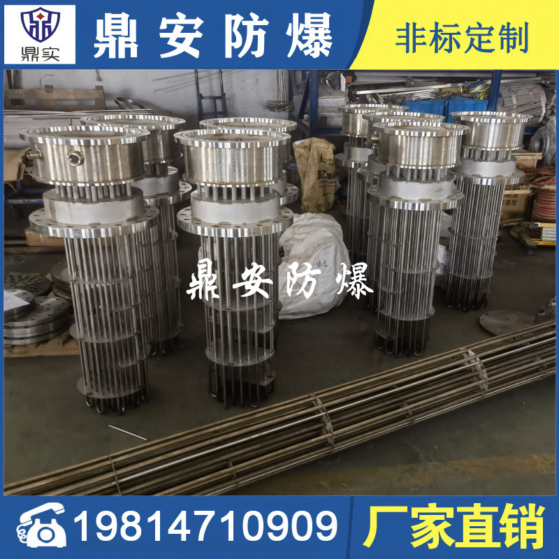 防爆法蘭加熱管是由多支加熱管焊接在法蘭上集中加熱。主要用于敞開式、封閉式的溶液箱和循環(huán)系統(tǒng)中加熱用。優(yōu)點: 表面功率大,使一般電加熱表面負荷的2~4倍,高度密集式、結(jié)構(gòu)緊湊。由于整體短而密集,故穩(wěn)定性好,安裝無需支架。組合式法蘭加熱管大多采用氬弧焊接方式使電熱管于法蘭連接,也可利用緊固裝置的形式,即每支電熱管上焊由緊固件。然后與法蘭蓋采用螺母鎖緊。管子于緊固件采用氬弧焊接。緊固件密封處采用科學(xué)的工藝。單支更換方便,大大節(jié)約以后的維修成本選擇進口及國內(nèi)優(yōu)質(zhì)材料??茖W(xué)的生產(chǎn)工藝,嚴(yán)格的質(zhì)量管理,保證電熱管優(yōu)越的電氣性能。